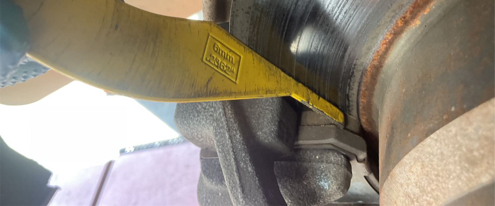 Her front brake pads had worn down to 3mm, which is the minimum safe limit. Even more concerning, one side was worn more than the other—a red flag for a sticking brake caliper. That uneven wear puts extra pressure on both the pads and the rotors.